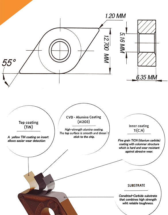 * Excellent chip control even when machining with a small depth of cut * Suitable for machining with a variable depth of cut.Proper rake angle of cutting surface finish and low cutting resistance * The MT-TiCN inner Coated is hard and wear-resisant against abrasive wear *