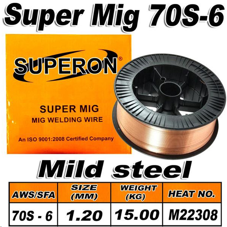 * Superon mild steel mig wire come in a 15kg spool * Superon ER70S-6 is a 15Kg 300mm Ø spool of copper coated low carbon all-positional Mig welding wire. This wire has excellent welding performance with a stable arc and less spatter, ER70S-6 is the most common wire for welding mild and medium strength steels. For best results keep wire clean and free from moisture and use with Argon/C02 Mix shielding gas for general Mig welding.