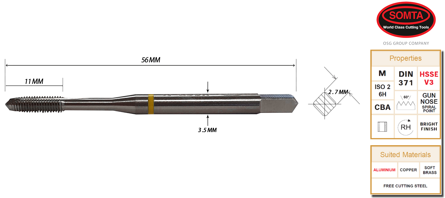 YELLOW BAND TAP: M3 X 0.5 SPIRAL FLUTE (SOMTA)