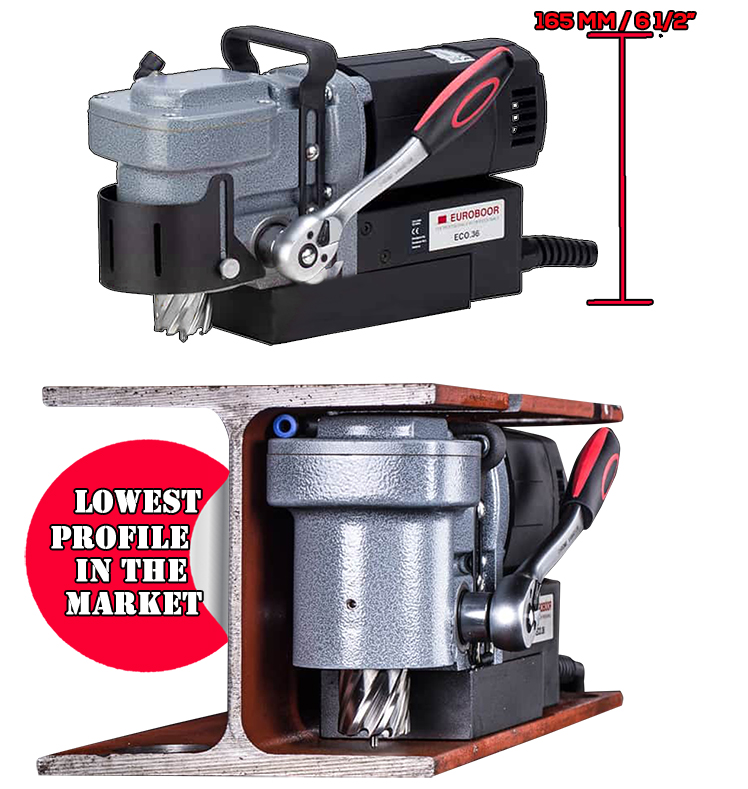 * The Euroboor ECO.36+ magnetic core drilling machine is the lowest drilling machine in the market, measuring only 6 1/2” (165 mm) height